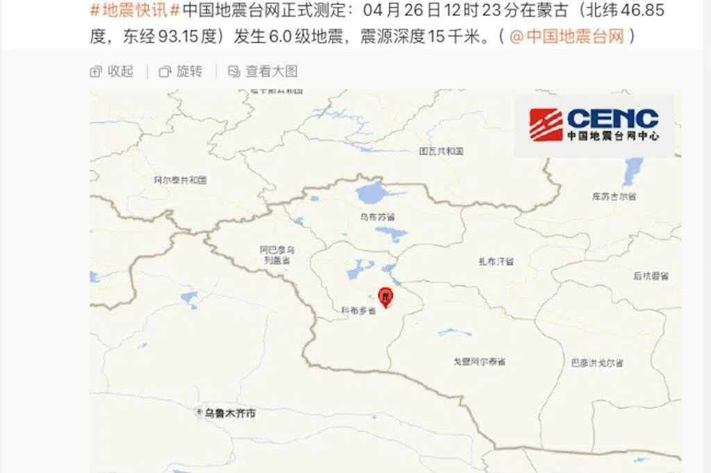 据蒙古国紧急情况总局4月26日消息,蒙古国科布多省当天中午发生5.5级地震。目前暂无人员伤亡和严重财产损失报告。另据美国地质调查局地震信息网消息,此次地震发生在北纬46.789度、东经92.968度,震源深度10公里,震级为5.9级。(新华社)