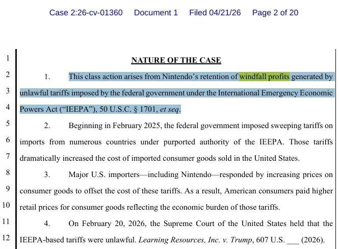 诉求也都差不多,那就是要求任天堂等公司建立一个受法院监督的透明基金,将未来从政府那里拿到的每一分退税,按比例退还给那些在过去一年(2025年2月1日到2026年2月24日)里支付了溢价的玩家。