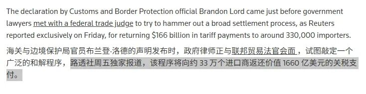 但是在今年2月,美国最高法院却裁定此前的关税政策属于“非法征收”。根据美国海关与边境保护局(CBP)的数据,他们依据这条紧急关税政策,共收取了额外关税和押金约1660亿美金。