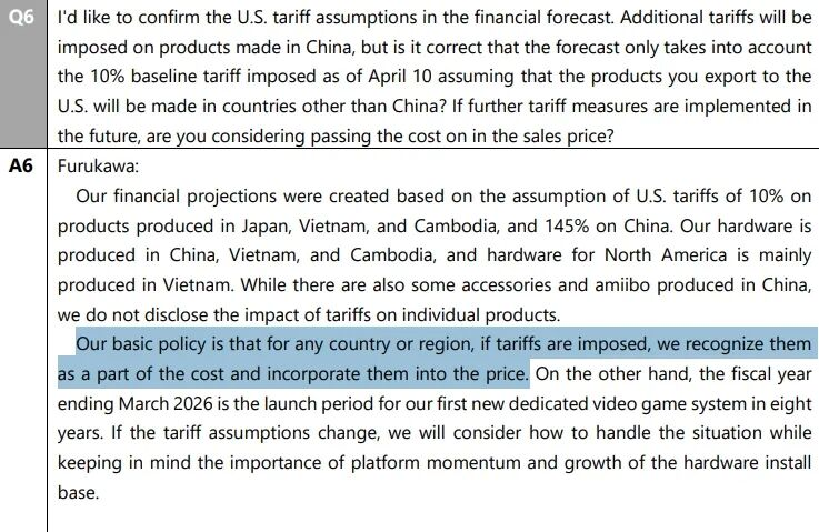 在玩家起诉任天堂的案件里,律师在诉状里直接引用了任天堂社长古川俊太郎在2025年5月财报说明会上的发言:“如果被征收关税,我们会将其视为成本的一部分,并将其计入价格之中。”
