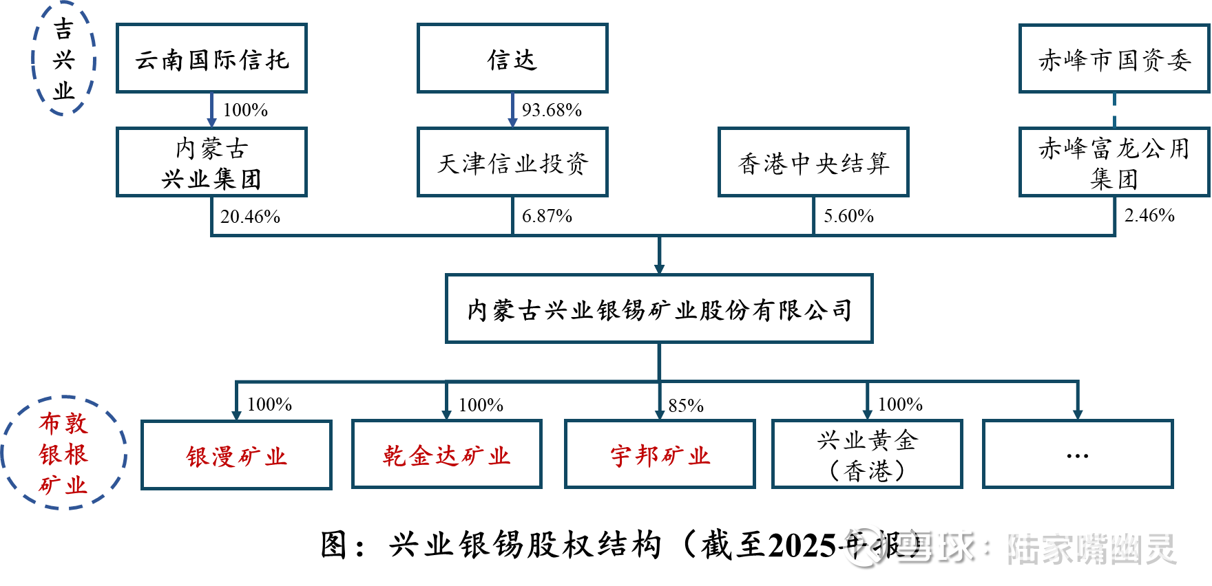 公司通过设立和参控股子公司来丰富产业链。图中下方为兴业银锡全资或控股子公司,标红的是未来四大主矿:银漫、乾金达、宇邦、布敦银根。其中布敦银根是兴业集团控股子公司,24年底委托兴业银锡管理,托管期限为3年。