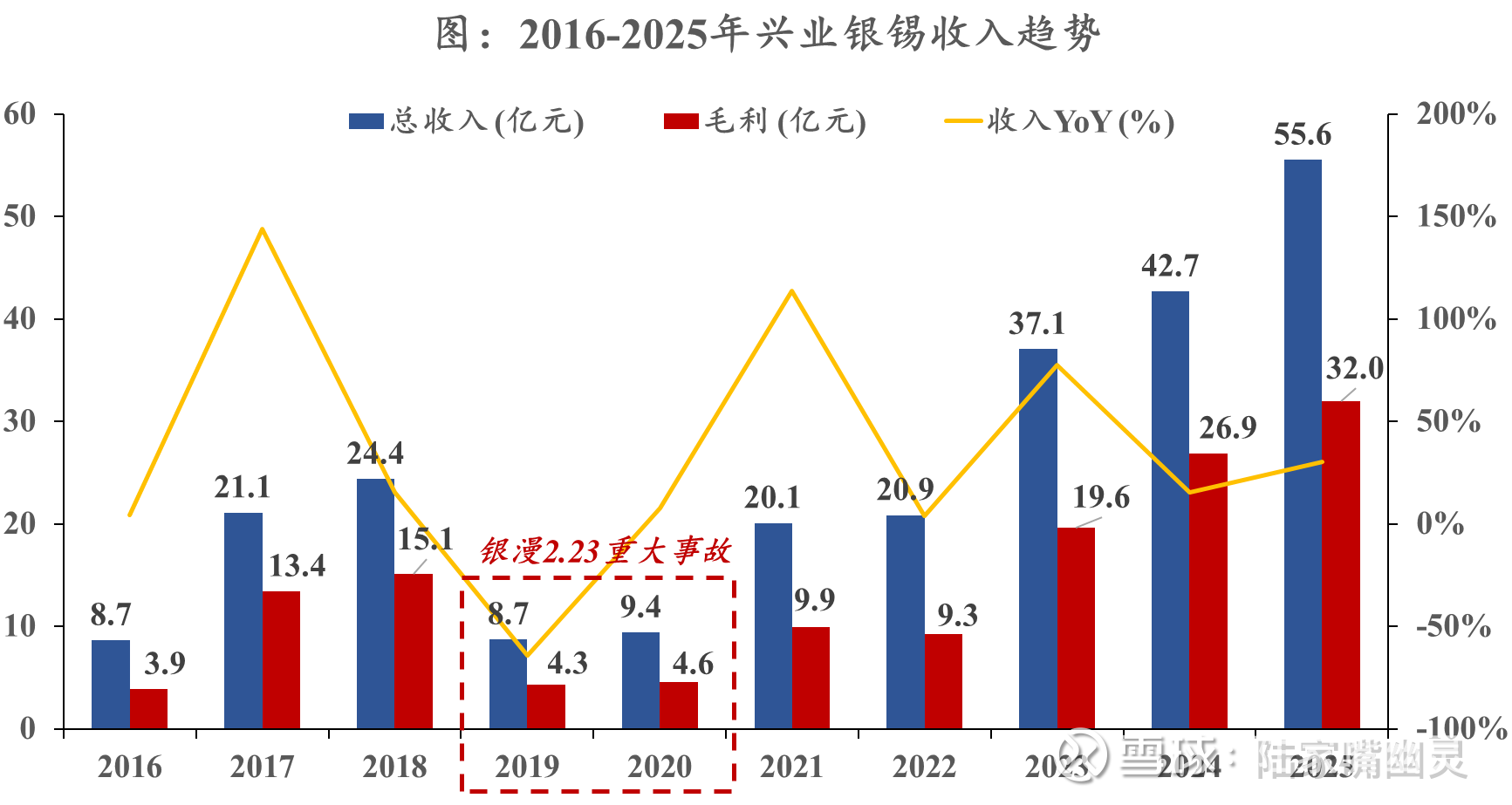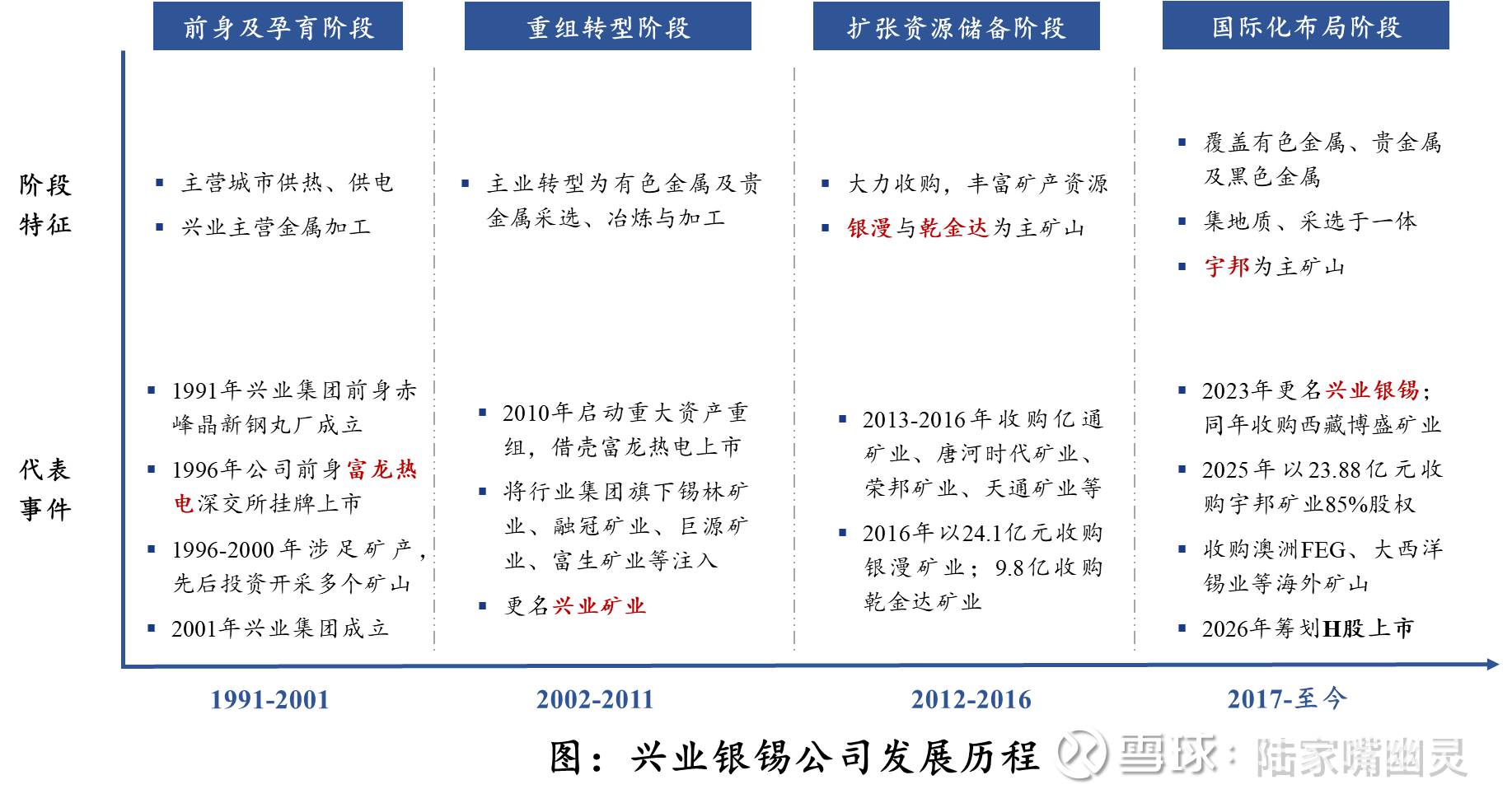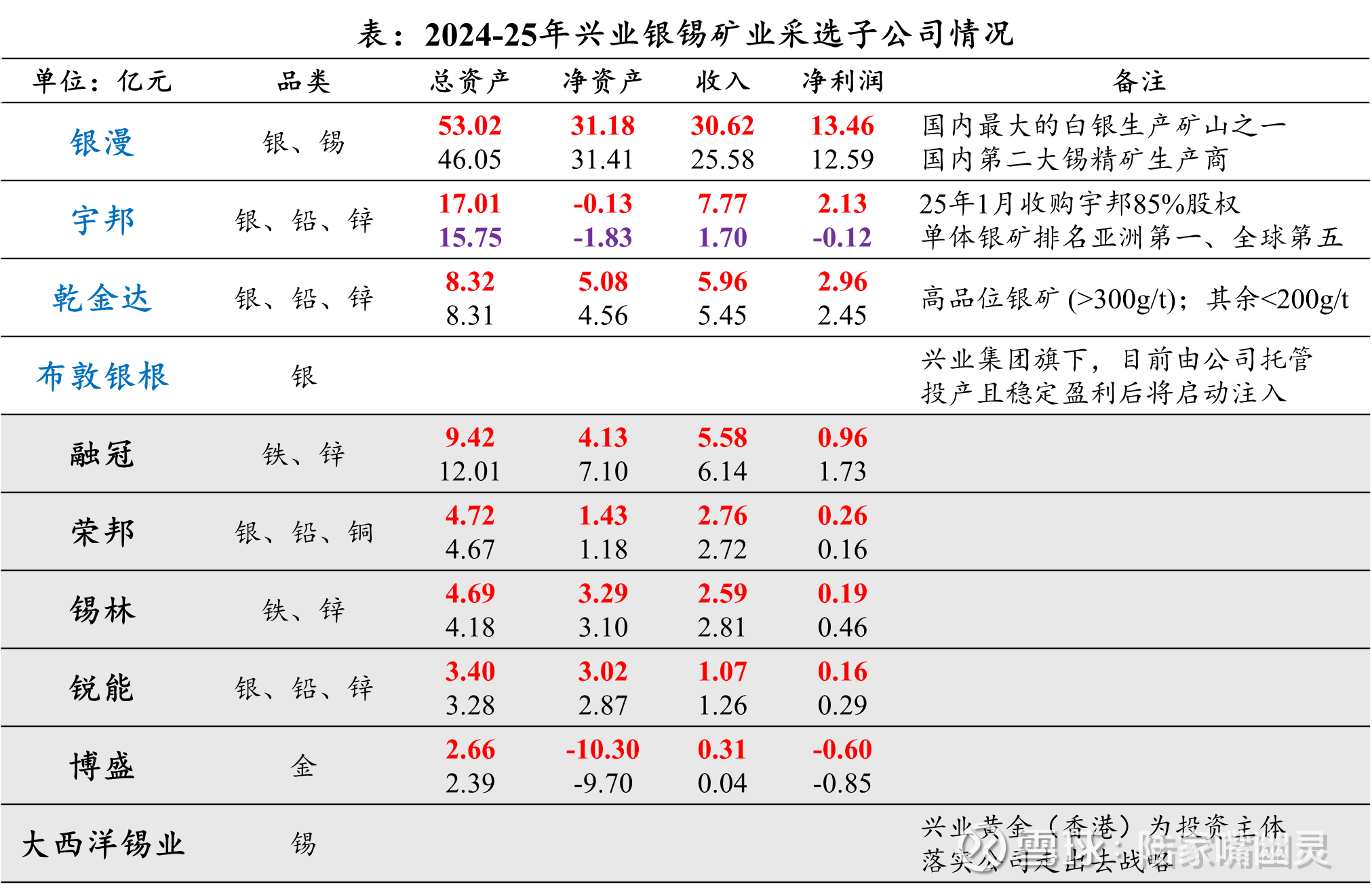 2023年,考虑到未来扩产主要矿种为银和锡,公司更名为兴业银锡。同年收购博盛来丰富金矿业务。2025年收购宇邦矿业85%股权,白银储量翻倍式增长