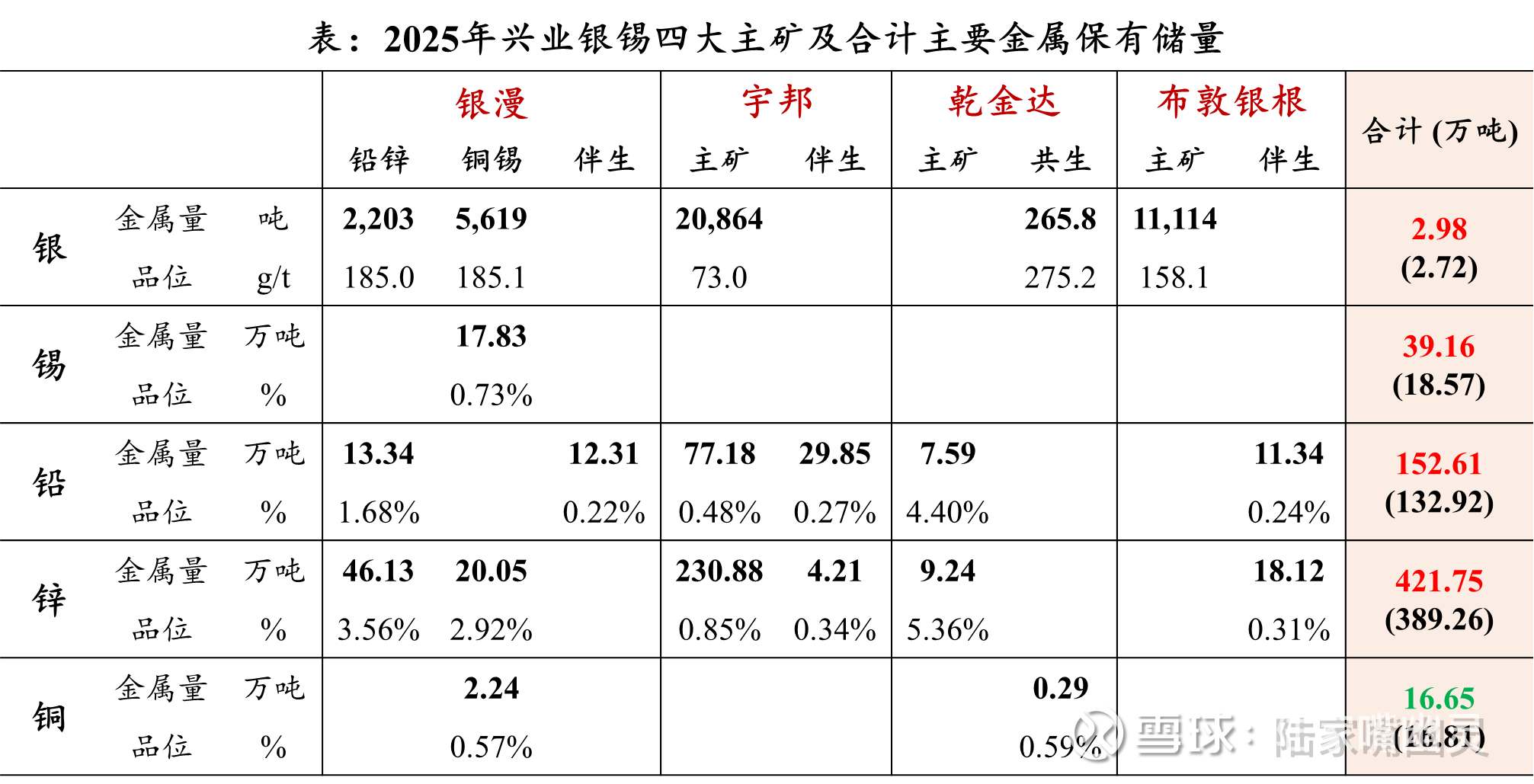 上表最右侧数是25年公司各金属的合计保有储量,括号里是24年数据。可以看到除铜储量有小幅下降外,其余金属储量都是提升的,特别是锡翻倍还不止。另外由于布敦银根还未注入,所以合计储量里还没包含布敦银根的。