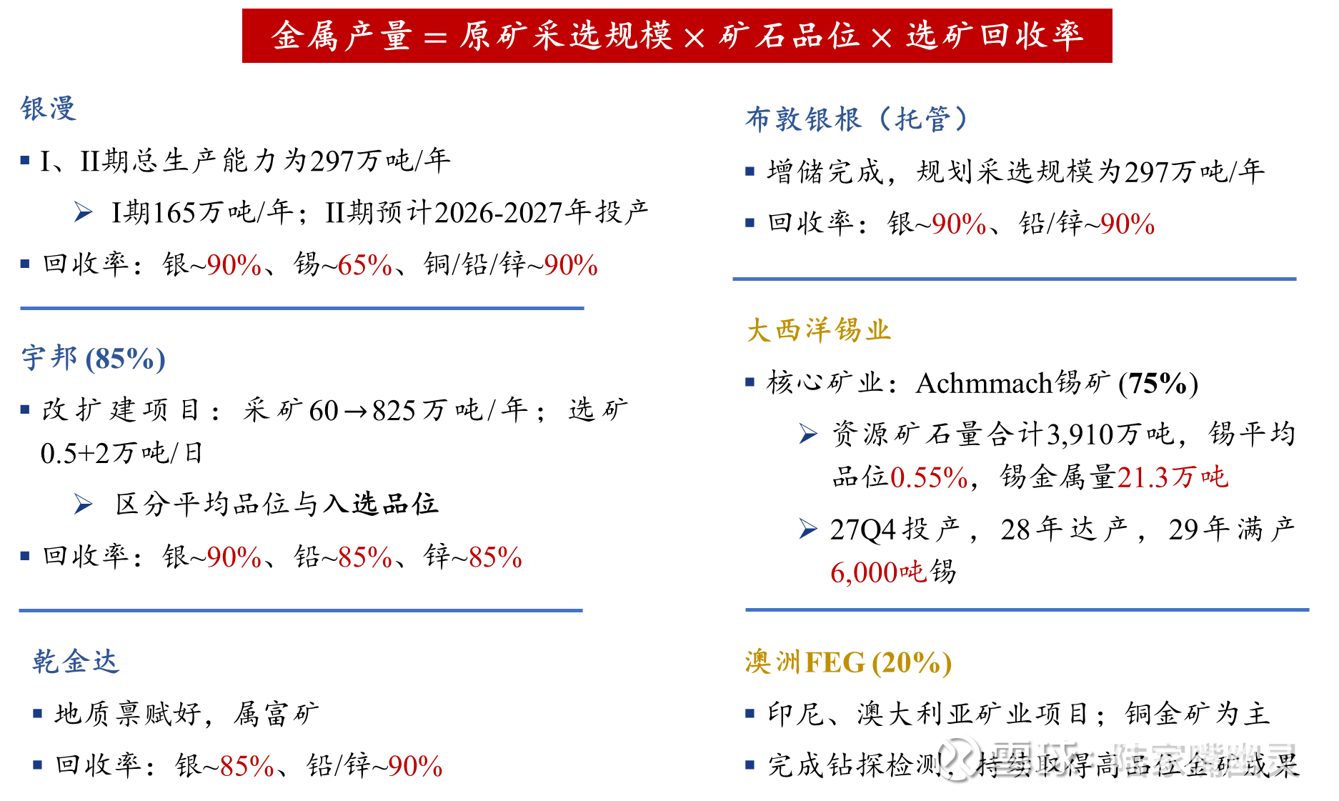 银漫:分1、2期,总生产能力297万吨/年,目前1期生产,2期预计26-27年完成建设。银储量8000多吨,平均品位185g/t。银、铜铅锌回收率约90%;23年技改前锡回收率只有50%,现在升至65%左右,远期目标70%。