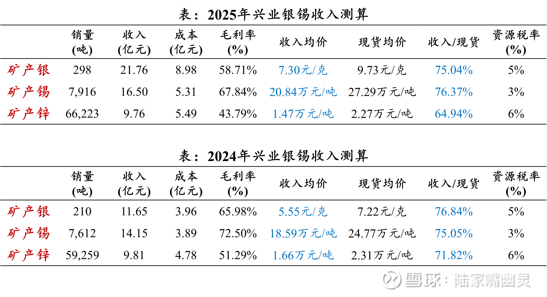 还有另一种估算方法,因为精矿粉要卖给别人冶炼,假设按现货价打9折卖,再扣除13%增值税率和5%资源税率,最终比例就是0.9 × (1-18%) = 74%。
