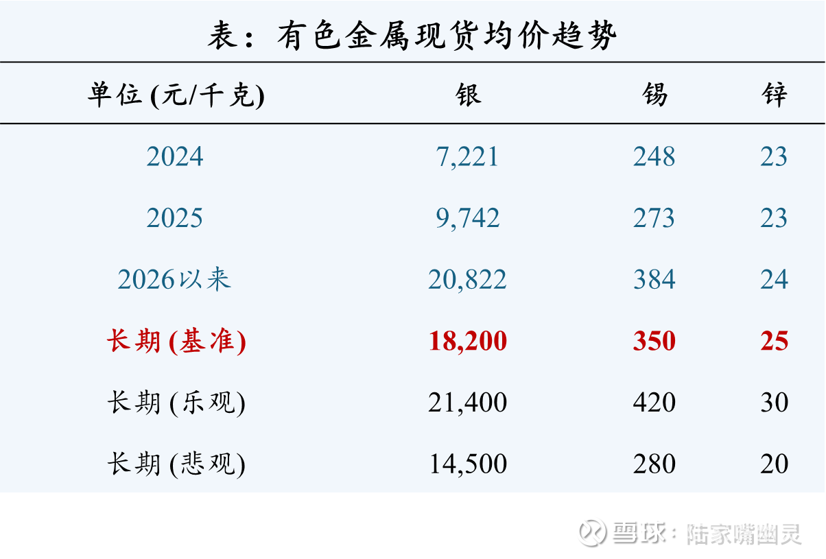 银价逻辑是,假设金价稳定在5000美元/盎司,按金银比60来算,银价83美元/盎司,也就是18.2元/克。但之前也提到金银比中枢有上升趋势,若按金银比80算,银价62.5美元/盎司,也就是13.7元/克。保守起见,本文用15元/克。