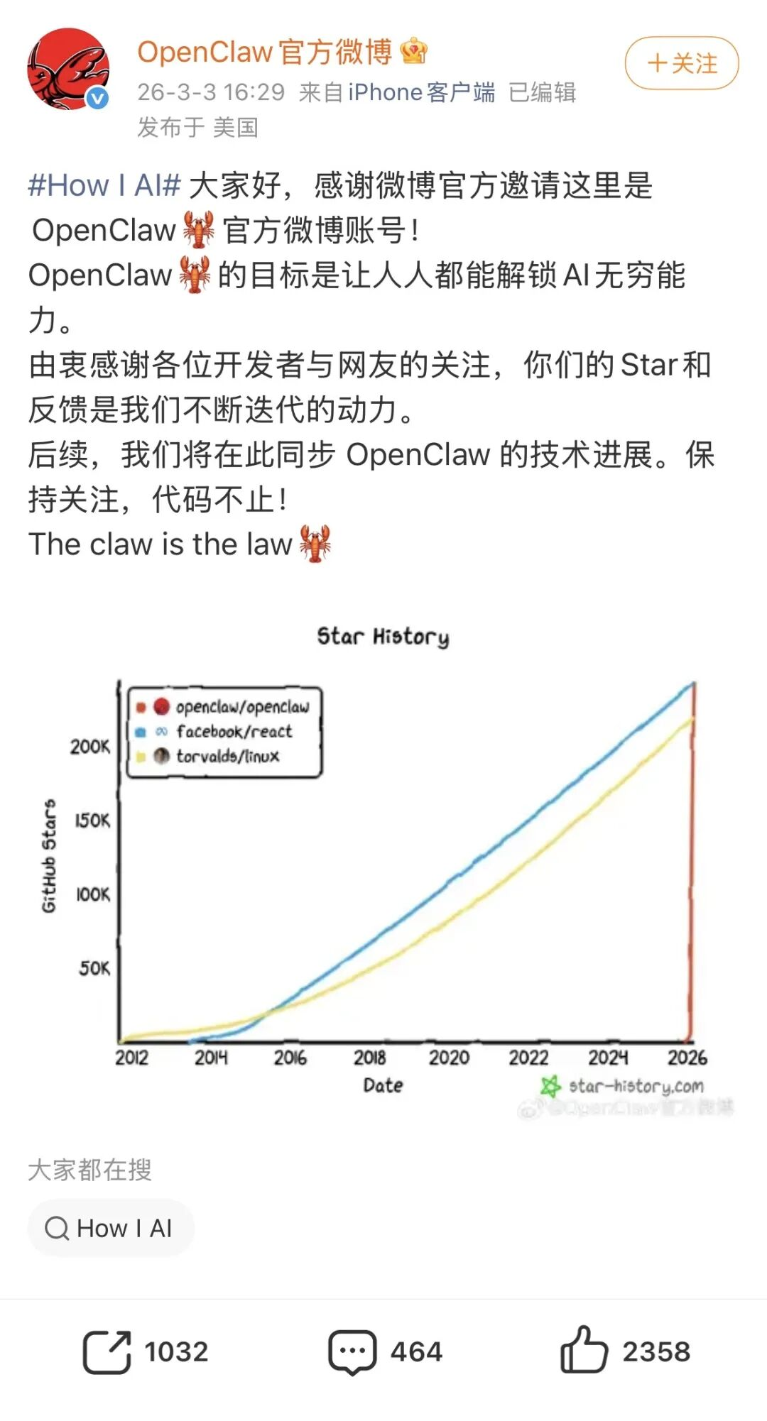OpenClaw发帖,图源官方微博