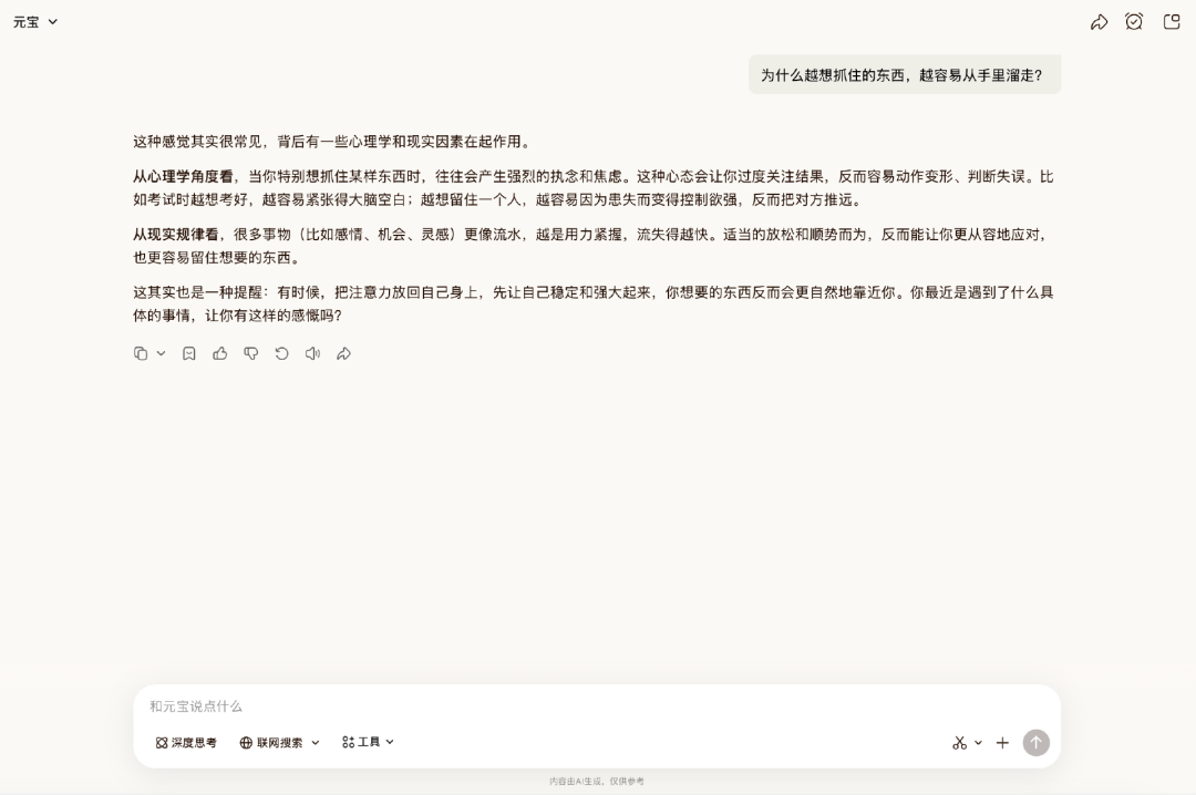 我确定的只有两件事:一是中国的国运,二是AI会带来整个基础设施和应用的大变革。其他的都不确定。所以不要把自己当神,不要什么钱都想赚,保持平常心,不断探究,跟真正的创新者在一起,抓住属于自己的机会就够了。越浮躁的时候,越要减少欲望,多去一线,结果反而会更好。