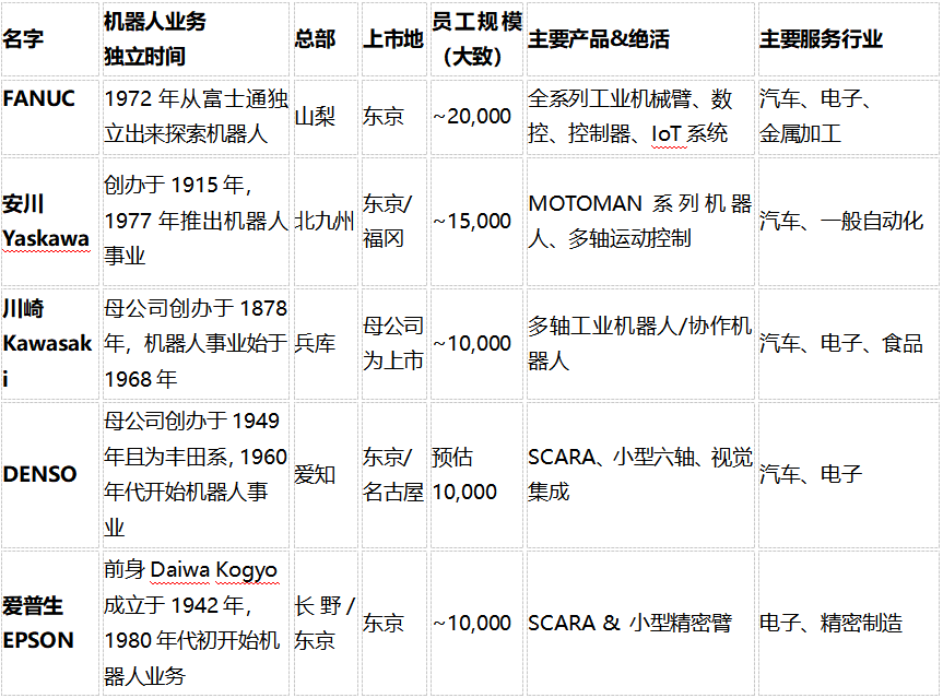 Fanuc的背景是富士通,数控专家出身,安川是电机、电气控制,川崎是重工业,Denso是汽车零部件起家、且与丰田长期合作。