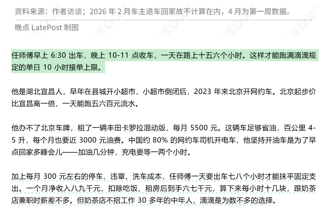 在收入还不错时入行,把自己的身体、作息都改造成适应网约车的模式。当收入下降后已经失去了转行和改变的可能。年龄每大一分,选择下降一截。但人的主观能动性其实在这其中并没有太多的发挥余地。我们无法责怪个体。