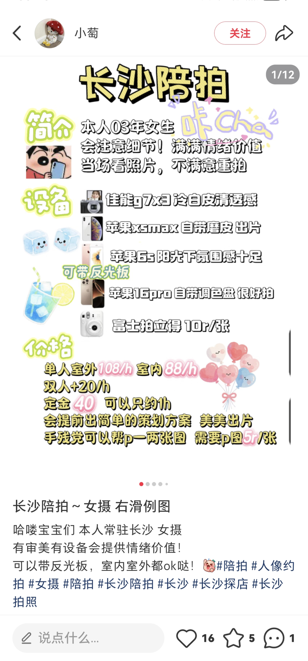 这8000元也为小萄提供了一种可量化的陪拍价值。她在小红书上宣传自己时,会标明自己的设备有佳能G7X3、iPhone XS Max、iPhone 6S、富士拍立得等,并在每一款设备旁边都标注诸如“冷白皮清透感”、“自带磨皮”等推荐理由。