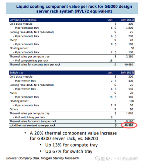 其实对于产业内的人士,更多称呼热管理。根据摩根士丹利最新发布的报告显示,英伟达GB300 NVL72机架级AI系统,单单是液冷散热组件的价值就高达49860美元(约合人民币近36万元),这已经比GB200 NVL72系统高了大约20%。