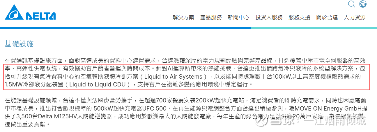 其实数据中心的热管理结构上非常简单,就是通过冷板吸收热量然后通过UQD和管道将热量集中到CDU,通过热交换最后将热量通过冷却塔排出,其中像冷板,UQD、Manifold岐管这些就是双鸿Auras、奇宏AVC、Cooler Master这些在供应,国内的那些厂家基本就是给这几家供货。而CDU因为和冷却塔集成在一起,这方面基建性质会更多,像维谛、台达就是做这些的,在台达的财报里面就将Cooling业务放在了基建里面。