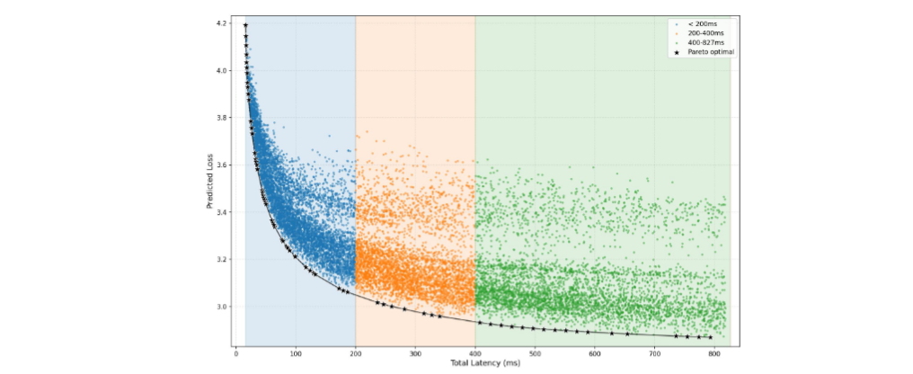 在此基础上,结合上述两个式子就诞生了PLAS(帕累托最优LLM架构搜索)框架,从而实现了协同设计。在公式中,只需要输入芯片的算力、带宽、缓存层次,以及工程约束(例如延迟<100ms、功耗、内存),自动生成最优的模型架构方案——找到“在当前硬件上,精度最高、延迟最低的那条边界”。简单来说,就是能同时找到算法能力和芯片设计的共同最优解。
