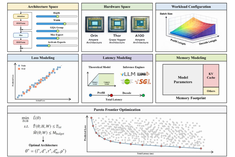 其次,内存子系统设计比算力峰值更重要。论文指出“宽而浅”的最优架构形态表明,内存带宽和缓存效率往往比理论TOPS更能决定系统实际性能。这意味着芯片内存层次设计要随需求变化,例如专门为KV缓存和注意力机制预留足够的高速缓存空间。