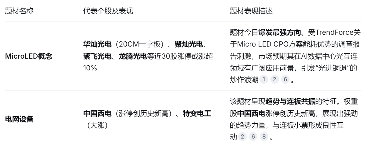 趋势股方面,市场热点呈现多点开花态势,以MicroLED为代表的科技股和以电网设备为代表的政策受益股表现最为突出。