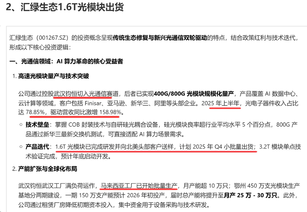 2024年,汇绿生态(001267)通过收购武汉钧恒科技35%股权,战略性切入该赛道,并于2025年初进一步实现控股(持股51%),确立了上市公司在光模块领域的重点布局。据汇绿生态披露,目前正对武汉钧恒剩余49%股权进行收购。