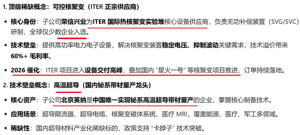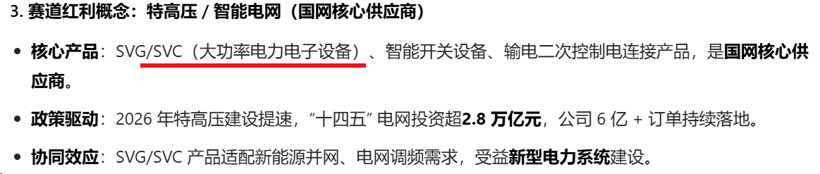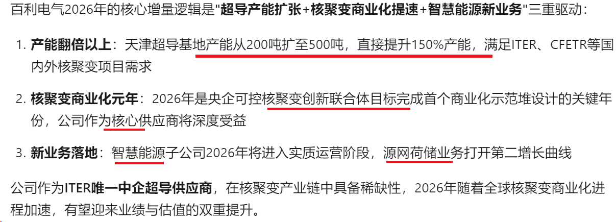百利电气(600468.SH)核心投资概念聚焦可控核聚变 + 高温超导 + 特高压 / 智能电网三大黄金赛道,叠加国企改革 + 业绩扭亏双重催化;2026 年增量主要来自超导业务规模化落地、核聚变设备订单释放、源网荷储新赛道开拓,同时传统 SVG/SVC 业务受益电网投资大年实现稳健增长,整体业绩弹性显著。