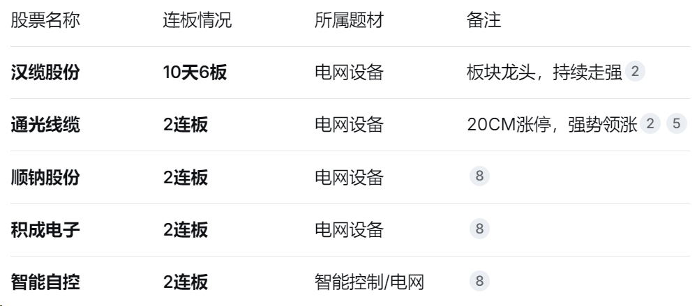 今日连板股的核心题材是电网设备,受北美缺电逻辑、美国大规模输电扩容项目(750亿美元)以及国内电力设备出口订单预期等多重因素驱动,该板块成为近期市场最具持续性的热点。汉缆股份走出10天6板的高度,通光线缆、顺钠股份等一批2连板个股形成梯队,显示资金对该题材的深度介入。