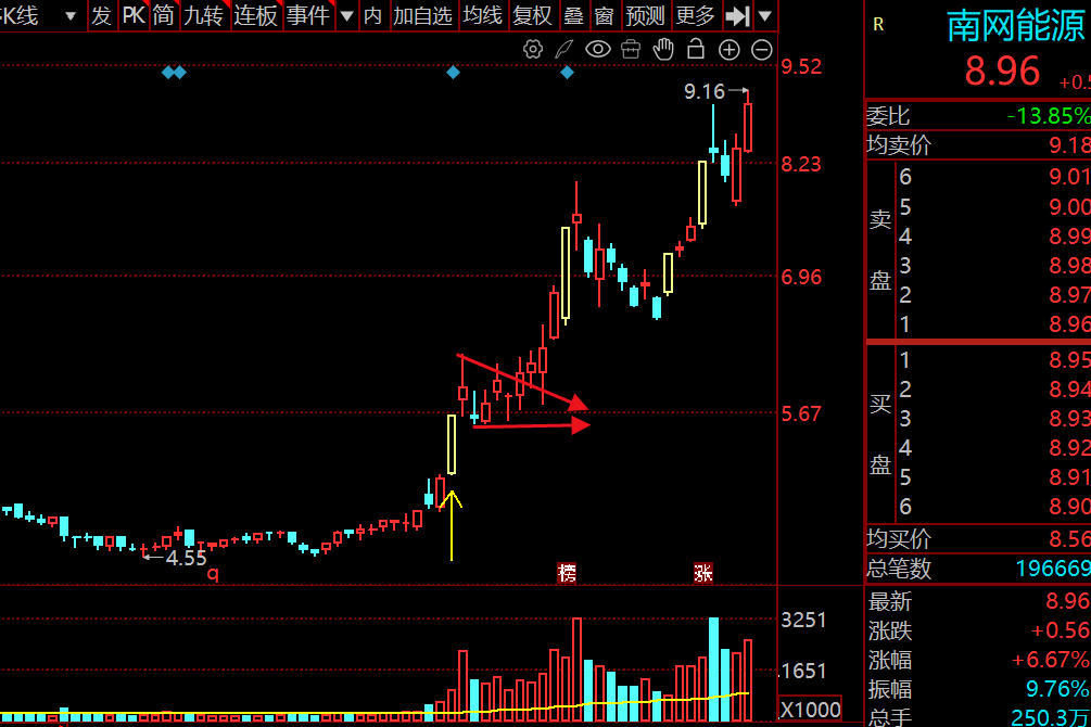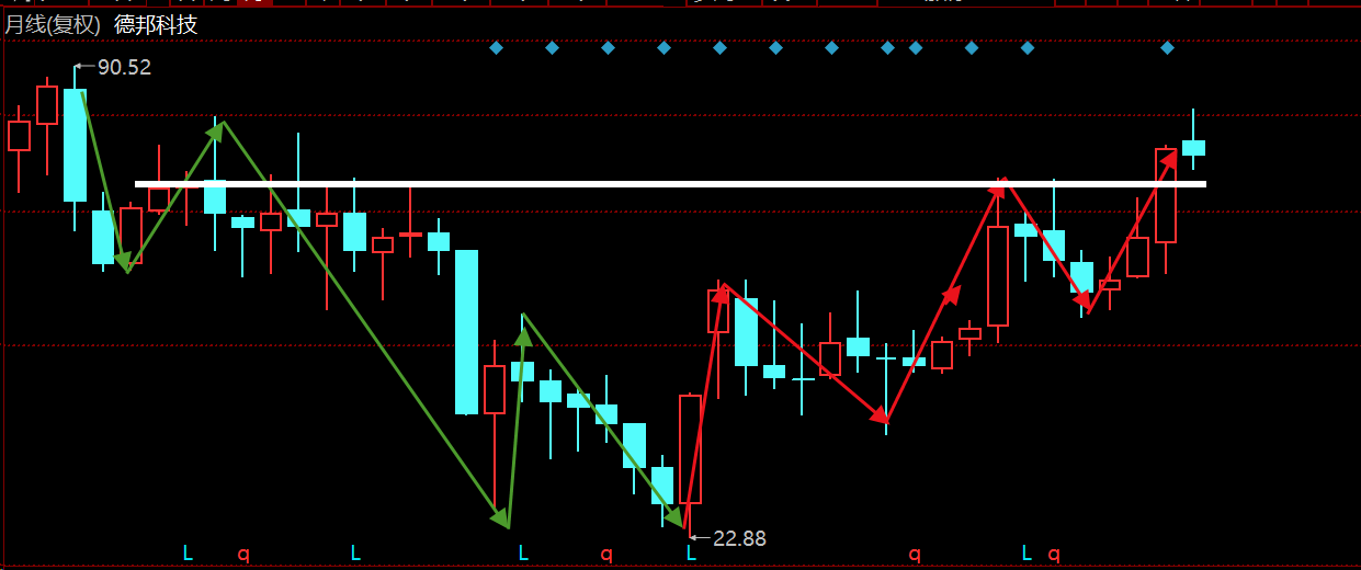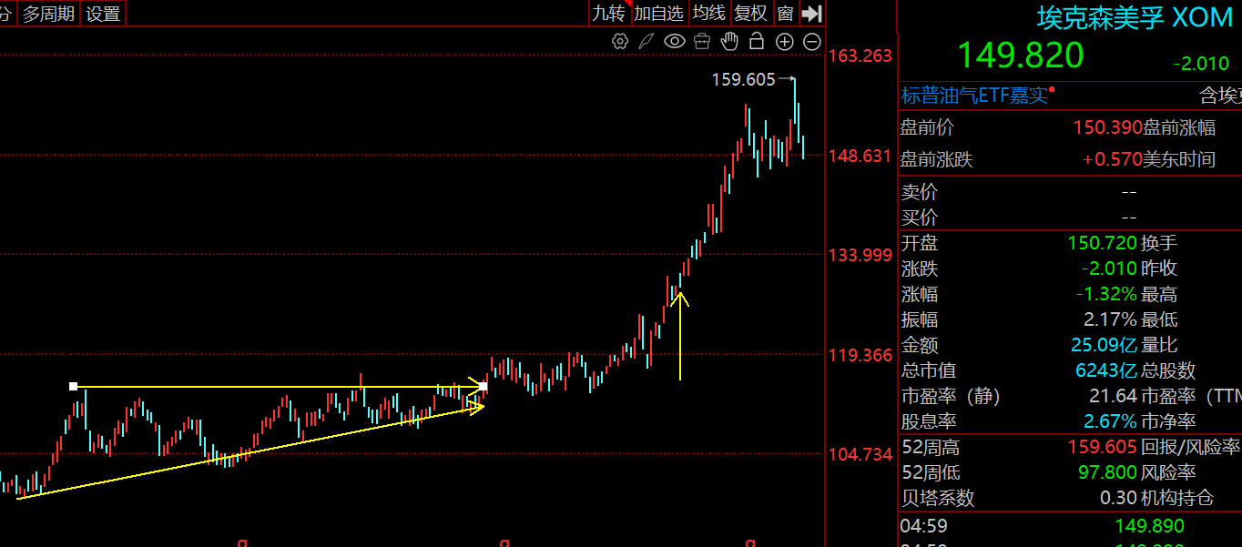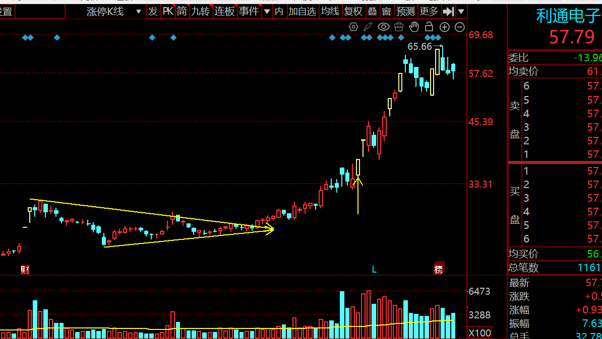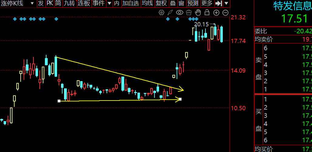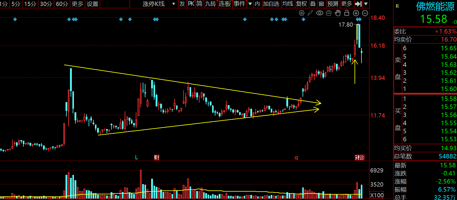 下边是一条向上倾斜的支撑线,说明低点在不断抬高。