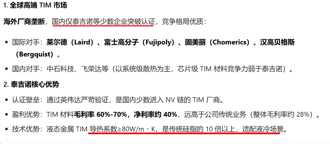 国家级专精特新 “小巨人” 企业,主营高端电子封装材料,覆盖集成电路、智能终端、新能源、高端装备四大领域,是国内电子封装材料龙头。2024 年 12 月收购泰吉诺,切入 AI 服务器高端散热赛道。泰吉诺核心业务是高端导热界面材料(TIM)研发、生产与销售,是英伟达 AI 服务器 TIM 材料核心供应商。