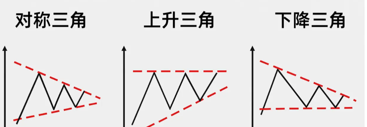 持续形态则相反,它意味着行情在经历一波快速上涨或下跌后,进入暂时的休整和蓄力阶段。形态完成后,价格大概率将延续此前的趋势继续运行。最常见的持续形态是三角形整理。