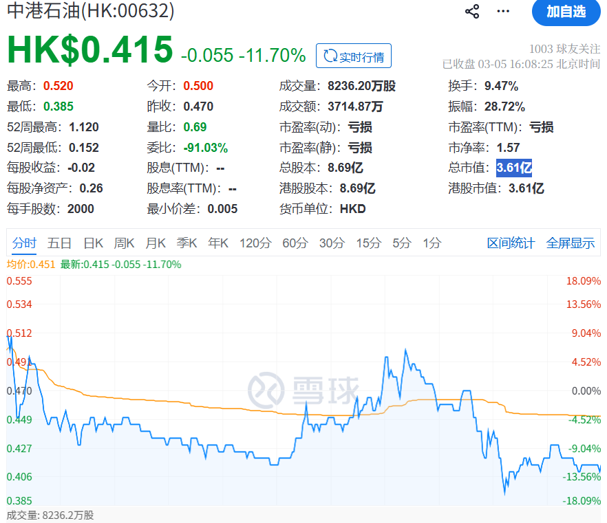 不过到了3月4日,港股油气板块全线退潮,中港石油股价单日大跌47.19%。