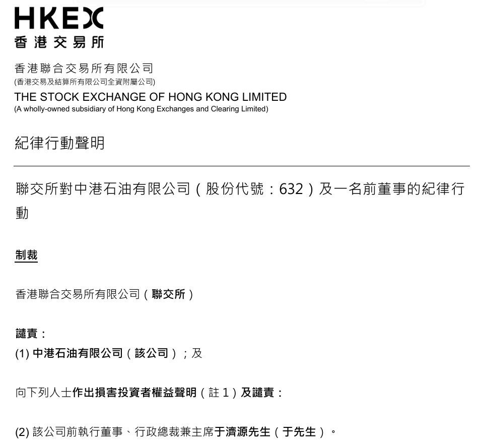 3月3日盘后,中港石油公告披露,公司及其前执行董事、行政总裁兼董事会主席于济源遭香港交易所谴责。