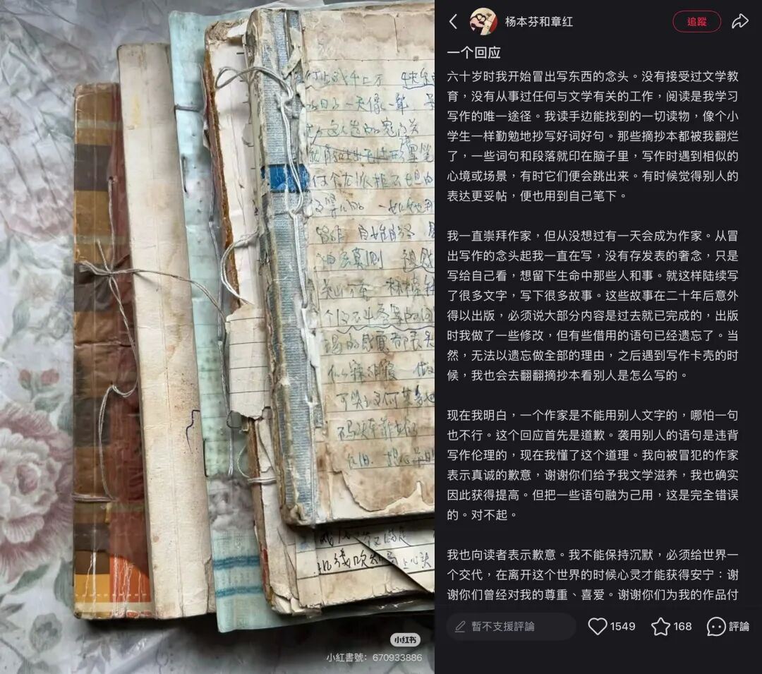 2月25日,账号“杨本芬和章红”发布致歉:“现在我明白,一个作家是不能用别人文字的,哪怕一句也不行。”她解释称,自己长期通过摘抄学习写作,动笔时那些誊写过的句子“有时便会跳出来”。