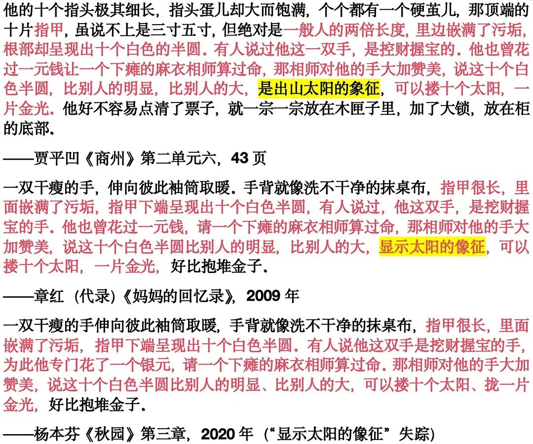 这个问题让他重新翻读杨本芬此前的作品。对照之下,类似的表达不止一处。2026年2月24日,他将比对文本发到小红书,将相似段落逐字标红。