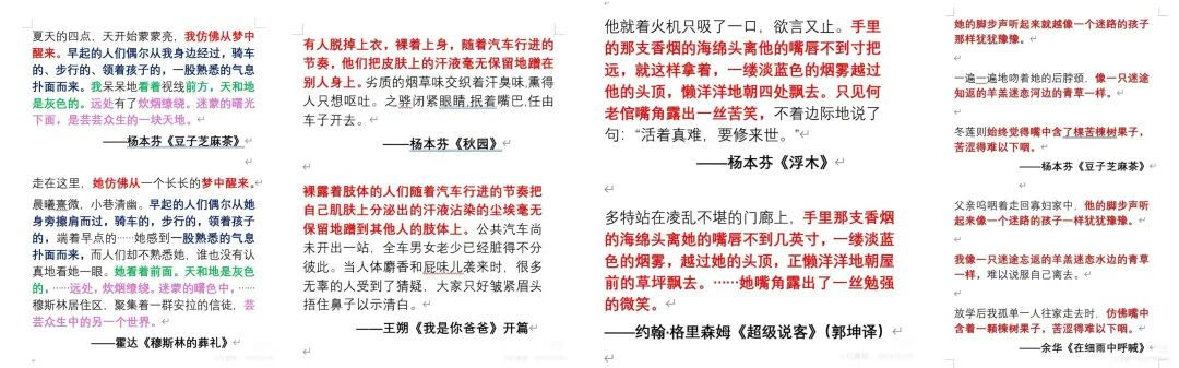 《秋园》里一段关于“炊烟缭绕”的描写,并排放在另一位作家的文字旁,标红部分连成一片,“我最开始喜欢她的那个地方,感觉被糊住了。像本来很干净的滤镜,上面多了一点脏东西。”