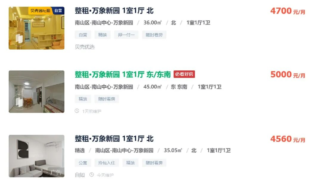 以位于南山中心区的万象新园项目为例,1房1厅房源主流户型为35~45平方米,今年1月和2月的租金挂牌价格普遍在4200元~4500元/月。但截至3月5日,同户型房源的主流挂牌价格已回升至4500元~5000元/月,涨幅约5%~10%。