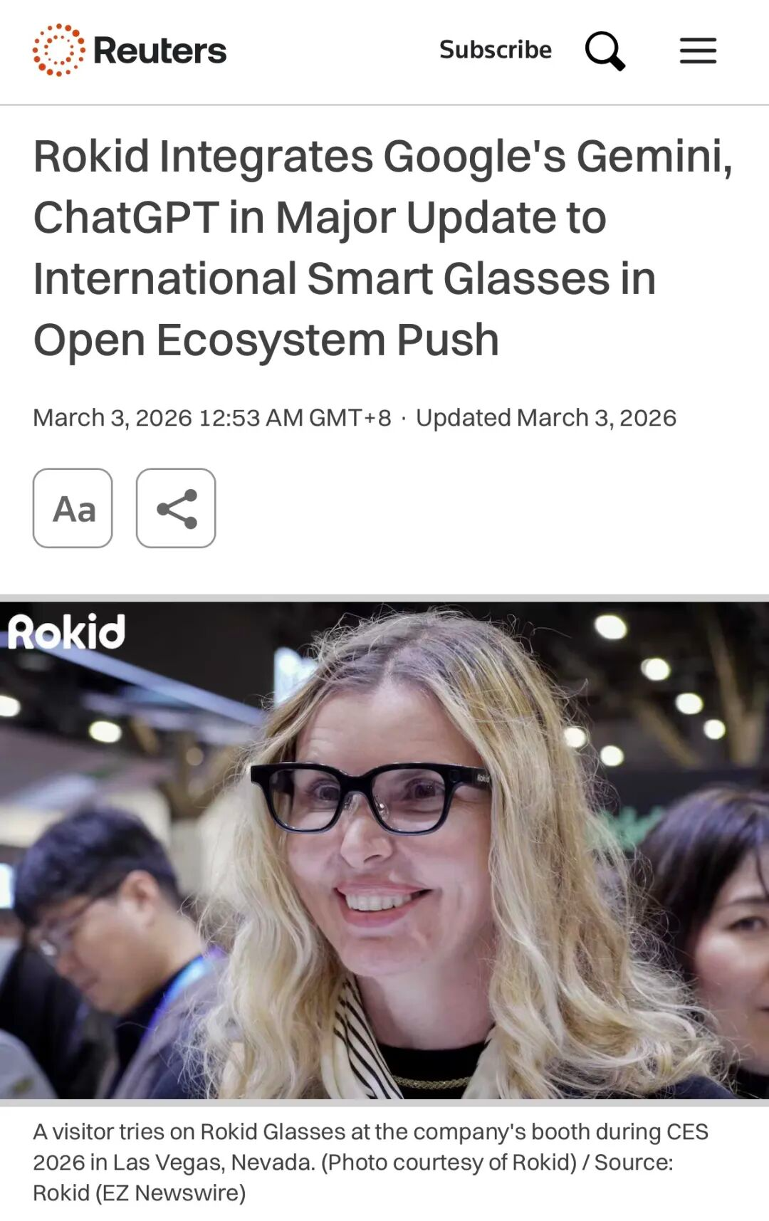 这个「首发」不是随便说说的。Gemini 是 Google 自家的旗舰模型,能在眼镜端接入 Gemini 并获得开发者认可,说明 Rokid 在海外的生态合作已经走到了相当深的层面。