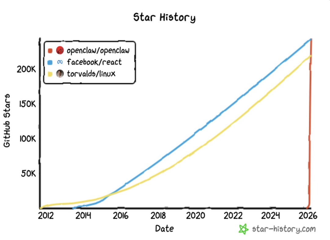 仅仅用了3个月, OpenClaw 在 GitHub 上的 Star 数登顶历史第一。它不仅直接跨越了 React 积累了 13 年的 24 万星关卡,更将拥有 40 年历史的 Linux 内核甩在身后,成为“软件项目历史第一”。