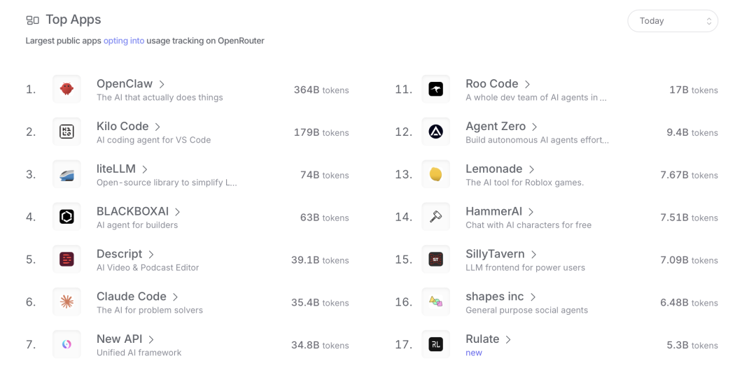 OpenRouter的后台数据也佐证了这种疯狂,最新数据显示,OpenClaw已是OpenRouter最大的单一应用,其Token消耗量约占平台显著比例。Token消耗从"按次"变成了"按流量",AI使用的成本曲线正在急剧变陡。