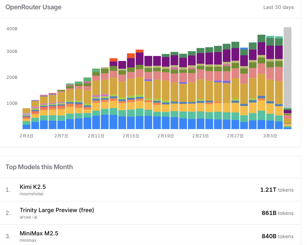 Kimi K2.5 在这轮浪潮中的商业回报已经显现。OpenRouter 数据显示,Kimi K2.5 是 OpenClaw 调用量最高的模型。受全球付费用户及API调用量大涨的推动,Kimi K2.5 发布不到一个月,近20天的累计收入已超过2025年全年总收入。