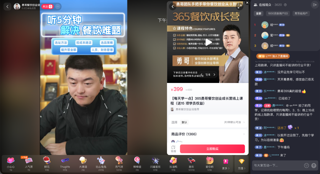 对餐饮创业者而言,花400元买课连麦,可能换来几十万曝光,“勇哥”在某种程度上成为了低成本的“抖加”。