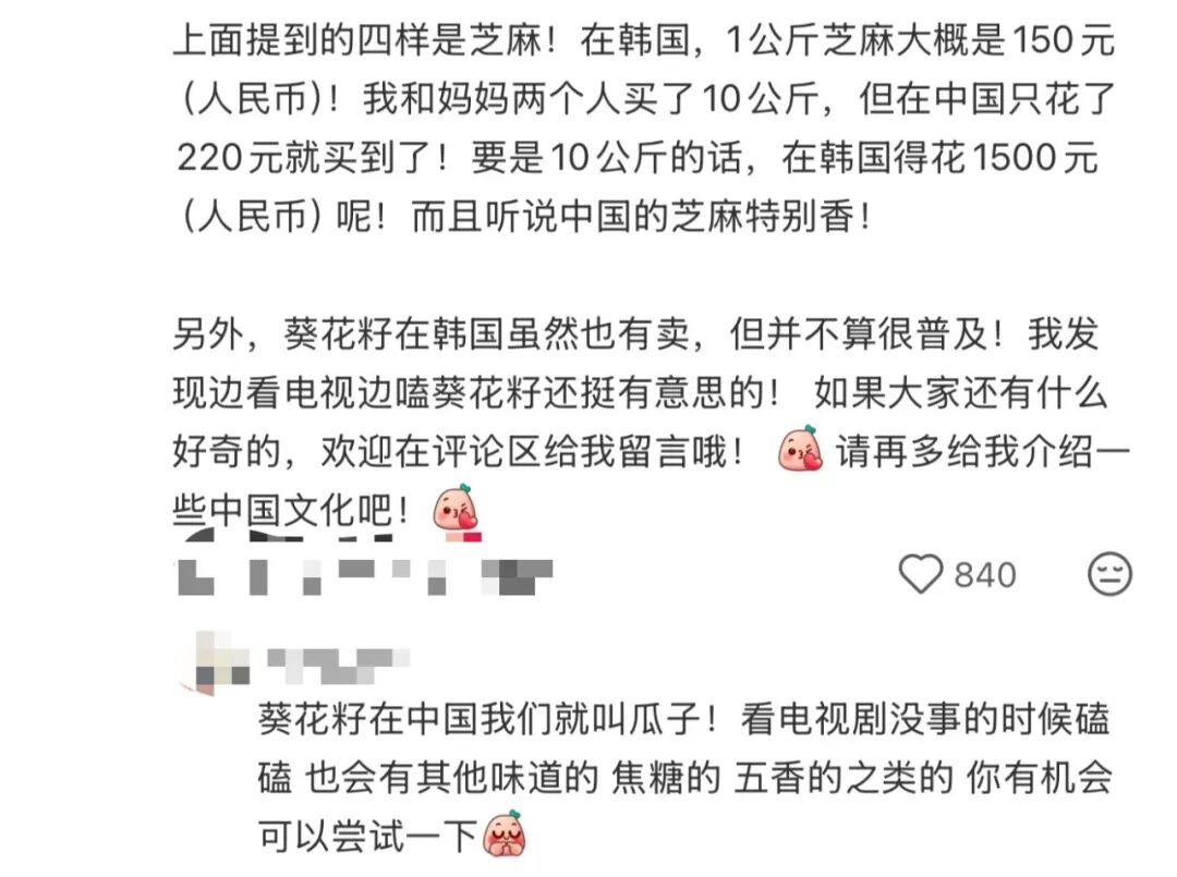 后来博主一解释才知道,在韩国,1公斤芝麻大概要150块人民币。这位网友和妈妈两个人买了10公斤,在中国只花了220元。“要是10公斤在韩国买,得花1500块,而且中国的芝麻特别香。”