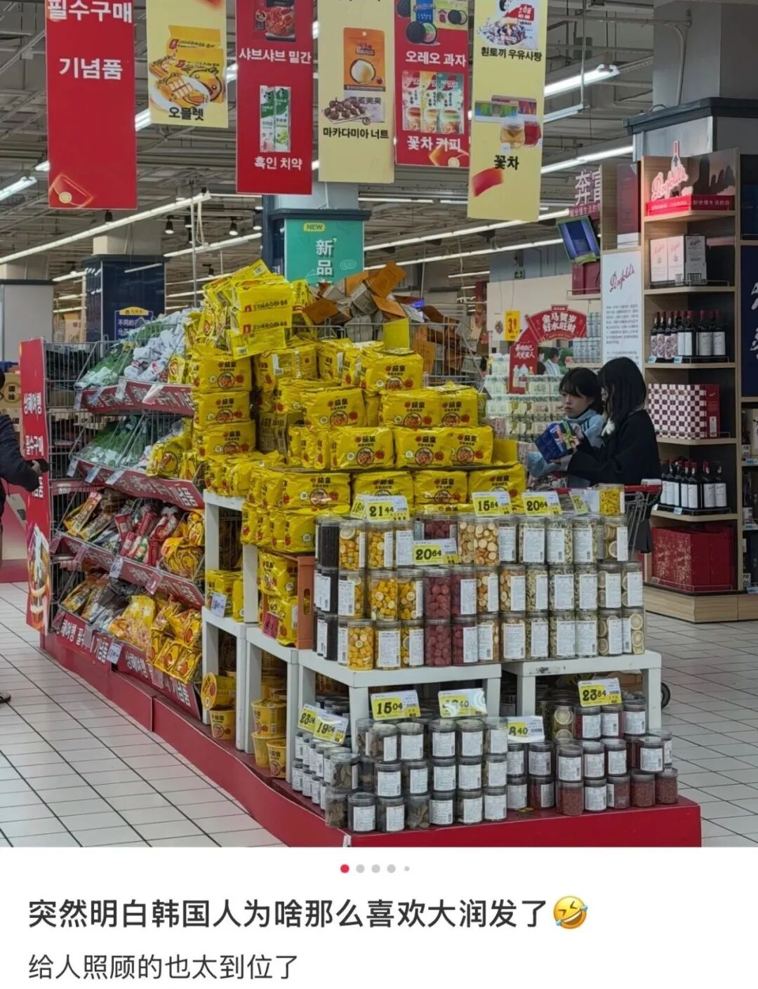 “大润发就像是中国的社区食堂,不高端但什么都管饱。韩国人逛大润发,就像回了趟远房亲戚家,东西随便拿,价格不用看,走的时候还能塞你一兜子,主打一个‘来了就是自家人’。”